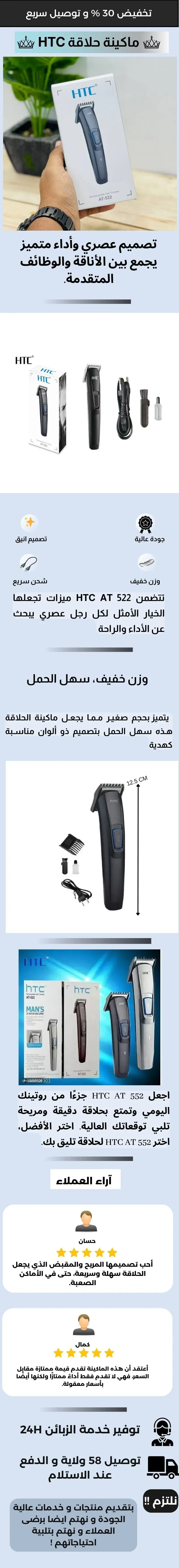 استمتع بتجربة حلاقة متميزة مع ماكينة الحلاقة HTC AT 552، التي تجمع بين التكنولوجيا الحديثة والأداء الفائق. تتميز هذه الماكينة بعدة مميزات تجعلها الخيار المثالي لكل رجل يهتم بمظهره ويبحث عن أداء متميز: 🎨 تصميم متقن وعصري: تصميم أنيق يناسب جميع الأذواق، مما يجعلها إضافة رائعة لأدوات العناية الشخصية الخاصة بك. ✂️ شفرات حادة من الفولاذ المقاوم للصدأ: تضمن شفرات الفولاذ الحادة والدائمة الحلاقة المثالية في كل مرة، مما يقلل من التهيج ويمنحك نعومة فائقة. 🔋 تقنية الشحن السريع: لا داعي للقلق بشأن نفاد البطارية، حيث توفر تقنية الشحن السريع وقتًا أقل للشحن واستخدامًا أطول. 👌 مقبض مريح ومناسب: تم تصميم المقبض ليكون مريحًا وآمنًا في الاستخدام، مما يمنحك التحكم الكامل والدقة في الحلاقة. 🛠 ملحقات إضافية: تتضمن الماكينة ملحقات إضافية مثل فرشاة تنظيف وزيت للصيانة، مما يسهل عليك الاحتفاظ بالماكينة في حالة ممتازة لفترة طويلة. اجعل HTC AT 552 جزءًا من روتينك اليومي وتمتع بحلاقة دقيقة ومريحة تلبي توقعاتك العالية. اختر الأفضل، اختر HTC AT 552 لحلاقة تليق بك. 🌟